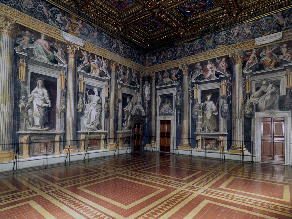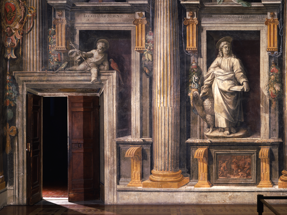The current appearance of the space dates back to the sixteenth century. The wooden coffered ceiling was produced in the sixteenth century to a design by Raphael, and the exploits and weapons of the patron Pope Leo X Medici (1513-1521) are shown in the spaces. The walls are decorated with an architectural scene painted with false columns supporting an architrave, above which there is a frieze decorated with garlands of plants and pairs of cupids. Between the columns, painted chapels host a series of Apostles and Saints. On the pedestals below there are false marble reliefs recalling the martyrdom of the figures represented above, while the personifications of the Virtues are shown above.