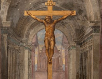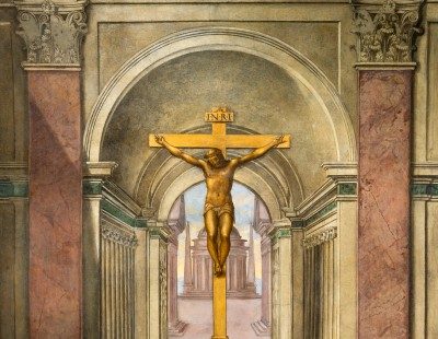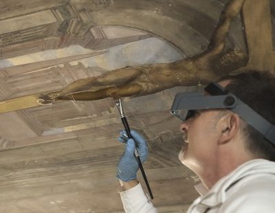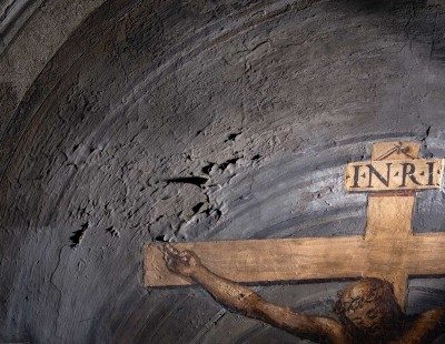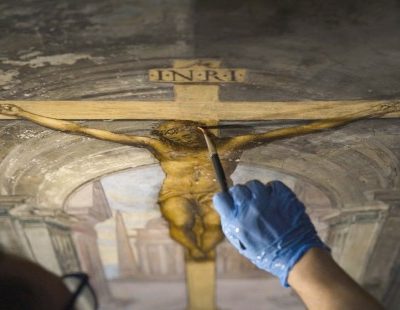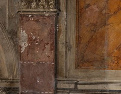 The conservation intervention, initiated in March 2015, focused initially on the east wall, where the magniloquent scene of the Vision of the Cross is located, and was completed in December 2024 with the restoration of the large painted tapestry that surmounts the entire decoration in the centre of the vault.