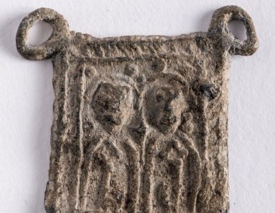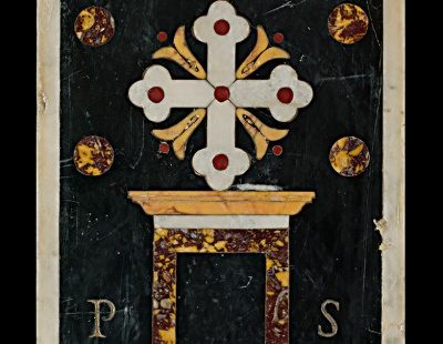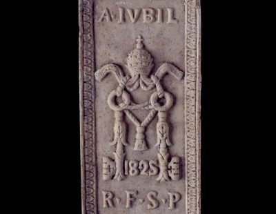 The polychrome marble sign - also chosen as the symbolic image of the exhibition – instead dates back to the 17th century Jubilee. Affixed to the Holy Door at the moment of closing, it indicated the place where the box with the keys and medals of the Pope was placed.
