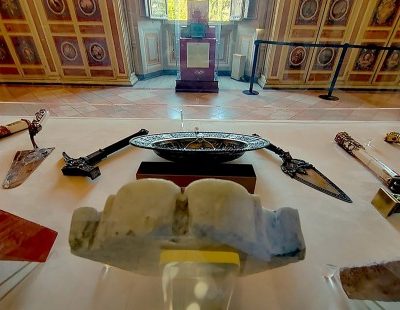 Visitors will be welcomed in the first room by the original Bull of Boniface VIII of Indiction of the First Jubilee in 1300, an important loan granted by the Vatican Apostolic Library for a limited period. Along the exhibition route it will be possible to admire a rich showcase of the Vatican Museums (Department of Decorative Arts) with more than thirty objects, symbolic of past Jubilees, and others that indirectly bear witness to minor aspects of the life of pilgrims on their way to the Roman basilicas. The attention of most visitors is attracted by the mason's everyday tools, such as bricks, hammers or trowels, which became symbols of the opening and closing of the holy doors and which were only later created by famous goldsmiths and silversmiths to designs by great artists. Particularly beautiful are those made in silver, ivory, pearls and precious stones for Pius XI, on the occasion of the 1925 Jubilee, by Pio Cellini, based on a design by Biagio Biagetti, then Artistic Director of the Vatican Museums, who set up a small gold forge in his office, inside the Hall of Blessings.