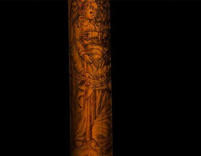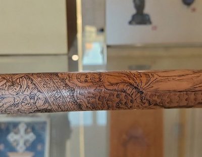Among the objects on display that still inspire curiosity among scholars today is the “pilgrim's staff”: a bamboo work that has intrigued several scholars and probably dates back to the mid-17th century. Scenes from the Old and New Testaments, the coat of arms of Pope Innocent X and a representation of Saint Peter's Basilica taken from an engraving by Greuter are painted on the surface with a thin stroke of black ink. Chronicles of the time tell of aristocratic men belonging to brotherhoods from northern Italy and central Europe entering Rome holding sticks painted with a complex decorative cycle.