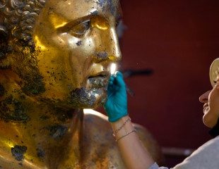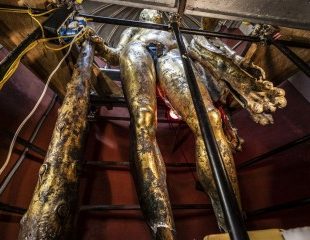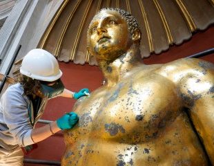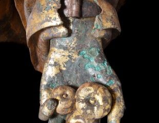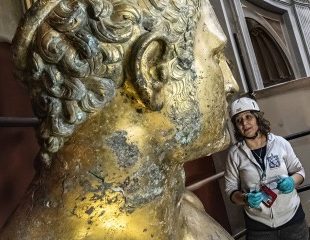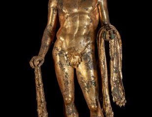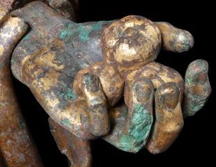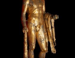 Con una altura de casi 4 metros, el coloso de bronce dorado destaca por su unicidad en el panorama de la escultura antigua. No es solo uno de los raros bronces casi íntegros que han llegado hasta nosotros; es la estatua de bronce más grande conocida, y la doradura – de alta calidad – se conserva aún en un estado excepcional.