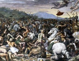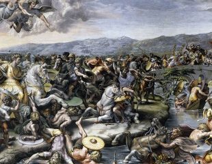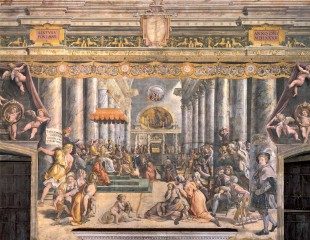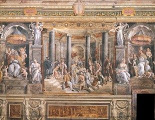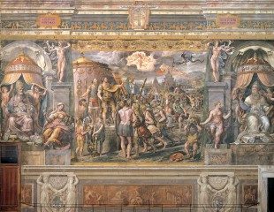 La Sala, la última que se añadió a la serie de estancias pertenecientes al Apartamento de Julio II y León X, pintadas al fresco por Rafael y su Escuela a partir de 1508, entre 1519 y 1524 fue objeto de una amplia intervención decorativa, que probablemente inició el Maestro antes de su muerte (6 de abril de 1520) y fue completada por sus alumnos bajo Clemente VII.