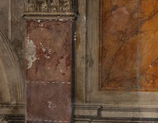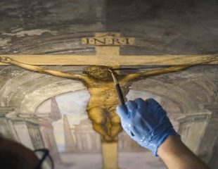 La intervención de conservación, iniciada en marzo de 2015, se centró en un primer momento en la pared oriental, donde se encuentra la majestuosa escena de la Visión de la cruz, y concluyó en diciembre de 2024 con la restauración del gran tapiz pintado que corona el conjunto decorativo en el centro de la bóveda.