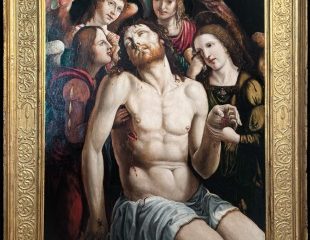 El Cristo muerto de Sodoma, realizado hacia 1505, representa el cuerpo de Jesús sostenido por cuatro ángeles. Esta pintura, perteneciente a la Archicofradía de Santa María dell’Orto de Roma, refleja la influencia de las experiencias juveniles del artista y su extraordinaria pericia pictórica. La figura de Cristo se inspira en una plaquita de bronce del veronés Galeazzo Mondella, conocido como el Moderno. Restaurada en los Museos Vaticanos entre 1933 y 1934, la obra está enmarcada en un marco del siglo XVIII decorado con el símbolo del ciprés, asociado a la Virgen dell’Orto y a la Archicofradía.